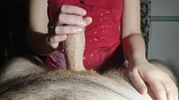Korean girl jerks off, sucking cock, and gets cum in her mouth