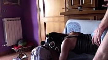 Laura is wearing a miniskirt and high heels, rough love on a sofa.