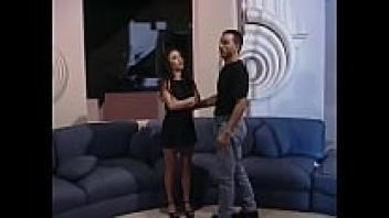 A beautiful long-haired brunette loves on a big sofa with an enthusiastic stud and places her pussy under an elastic tongue.