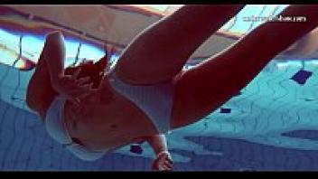 In the pool, attractive women undress.