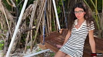 When no one is looking, a woman wearing glasses urinates loudly while sitting on a swing.