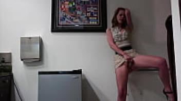 1030-II: A white woman wearing a satin set of thongs, dresses, stockings, and heels is sucking, rimming, and loving.