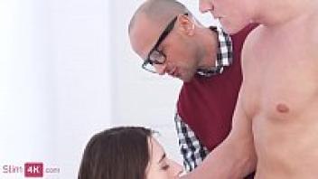 A brunette nerd with natural breasts gets DP&ed and consumes a lot of fresh sperm.