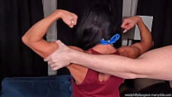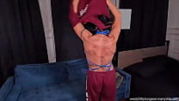 A Redhead woman bodybuilder uses gym equipment to masturbate.