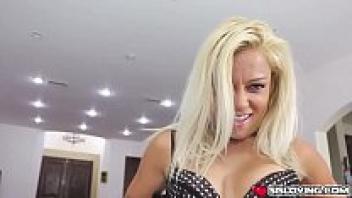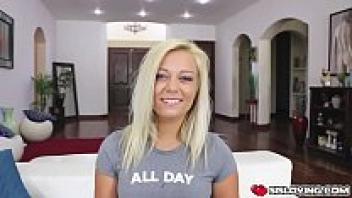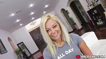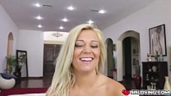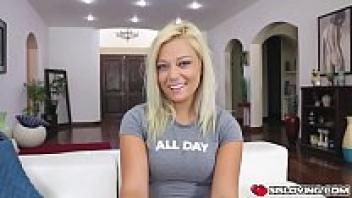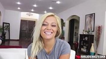 Allie James, a cute blonde, rides cock until a guy cums inside her.