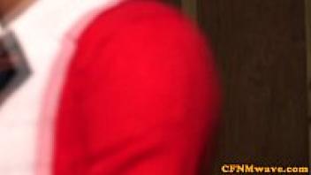 Wanking dude being helped by a busty CFNM girl