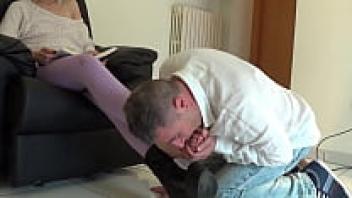 Foot fetish. The domineering Mistress's feet are kissed and licked by the slave. The slave spit in his mouth.