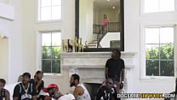 Kylie Quinn engages in mixed-race blowbang with thirteen different guys.