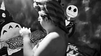 In her bedroom, a curvaceous adolescent is passionately masturbating.