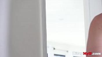 Brunette stepmother purchased a new bikini. It's blue, seductive, and seems quite little.