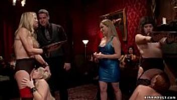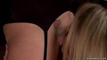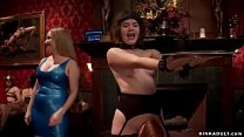 In bondage, a hairy pussy slave rides on top of a Sybian.