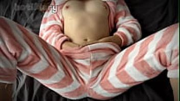 Stepsister masturbating in pajamas with a cum squirt, eager pussy, and little tits