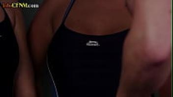 In the locker room, CFNM swimwear babes provide group HJ.