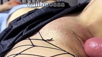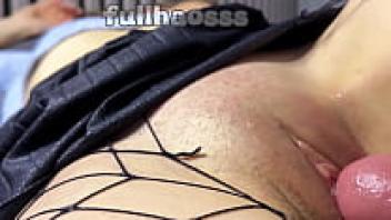 Close-up of a hairy, pussy schoolgirl wearing a stepdad bid cock creampie