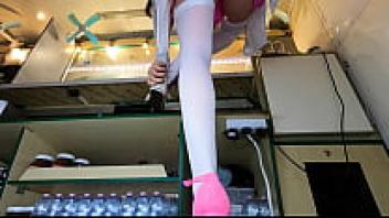 Pretty young brunette girl is getting ready for her first upskirt flashing session at work. She is very excited about this opportunity.