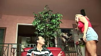Being so horny that she can't wait another minute, a busty, older blonde disturbs a guy who is watching football.