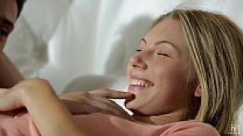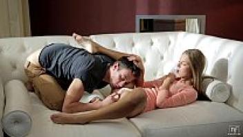 On the sofa, a gorgeous blonde wearing fishnet stockings is in love with her boyfriend.