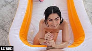 Big Cock is massaged by sweet Sophia besides the pool.