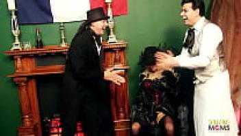 French babe in a black satin dress, red garter belt, black satin panties, red velvet stockings, heels, blowjob, and dirty talk in 1583 (02)