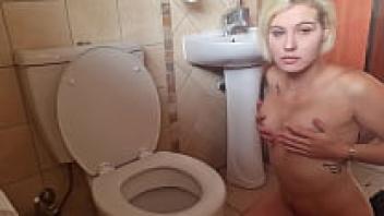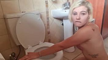 a blonde toilet is licking the toilet and flushing her head, and she wants you to urinate on her.