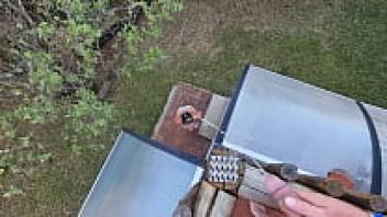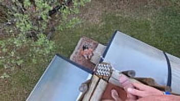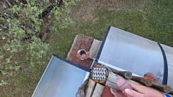 Close-up of a shaved pussy urinating outdoors