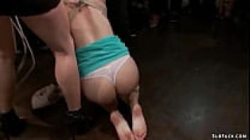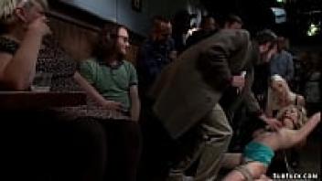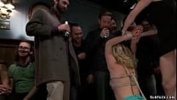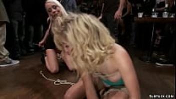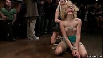 BDSM: A blonde lesbian with an oiled body gets bound up.
