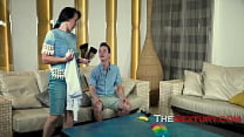 A guy on the couch is seduced by a brunette MILF wearing spectacles.