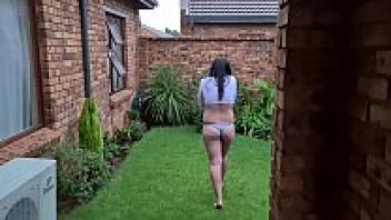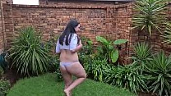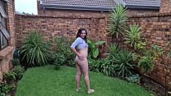 Chubby babe pissing in the garden during a thunderstorm wearing a wet shirt.