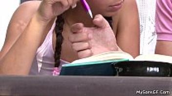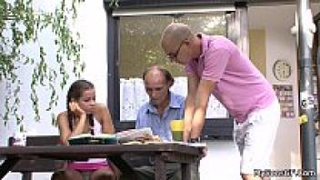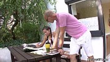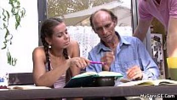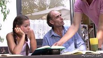 Brunette teen's first time cheating on her husband with an elderly man