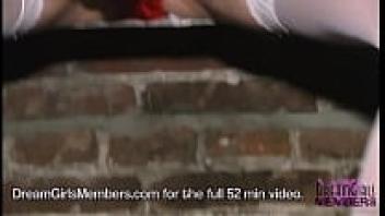 The lips of a blonde wearing red fishnet stockings is filled with sperm.