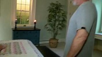 After hot, sweaty, passionate sex, the petite tanned youngster swallows his cum and puts the ancient grandpa's cock in his mouth.