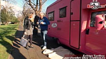 A car tows a tiny, German-blond street hooker for outdoor sex