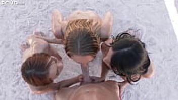 LUBED Oily Busty Babes Share A Thick Dick in the Sand.
