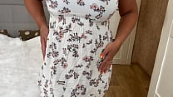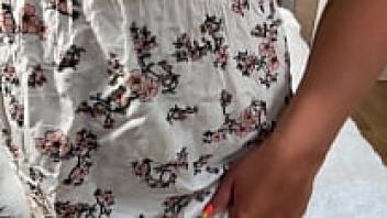 In a miniskirt, a seductive stepmother masturbates her creamy pussy.