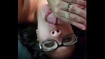Mature wife gives me a blowjob, and I cum in her mouth. She smears sperm all over her large breasts. Homemade oral sex for an overweight couple. Amateur fetish.