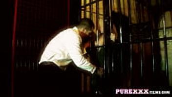 A stunning brunette entices him with her purple underwear.