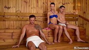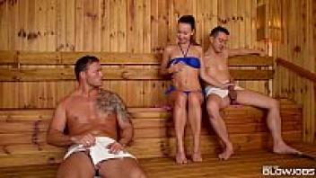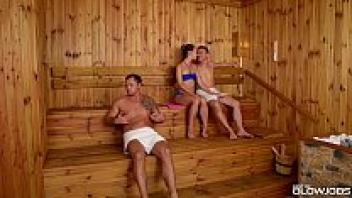 Taylor Sands, a sauna girl, swallows off the cocks of two strangers.