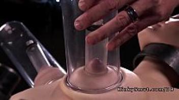 In bondage, a hairy pussy slave rides on top of a Sybian.