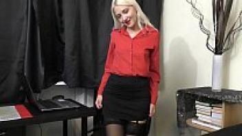 A horny secretary masturbates and displays her pussy up close.