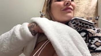 Mature wife gives me a blowjob, and I cum in her mouth. She smears sperm all over her large breasts. Homemade oral sex for an overweight couple. Amateur fetish.