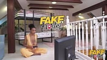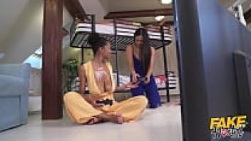 After playing an intense video game that gets their tits all sweaty and makes them hungry to suck and love cock, FAKEhub - Video game playing Asian Thai teen girl and enormous natural tits ebony latino woman in threesome after the game